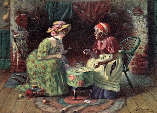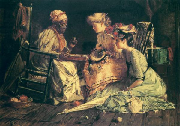 The most significant painter of American cartomancy is probably Harry Herman Roseland (c.1867—1950). He was born and died in Brooklyn and was most known for depicting the lives of African-Americans, especially black women reading tea leaves, palms and cards for white women. Oprah Winfrey has stated that her favorite picture in her own collection is, ironically, Roseland’s wrenching portrayal of “a woman who is about to be sold into slavery and separated from her young daughter,” To the Highest Bidder. (Oprah has two more of Roseland’s paintings in her library.) See more of Roseland’s work here and here. Compare the works below with the images of cartomancers from Russia, France, England and Italy found here. And read “Aunt B’s” cultural analysis of these paintings here.