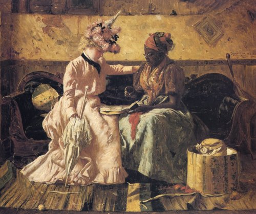 Yes, these paintings are interesting. Looking at them I see ‘equality’ that is, the body positions of each woman are equal, the same height. And even within that equality, the black woman has power, a gentle, non-threatening power. She has something that the white woman has no way of finding out by herself, only until the time the event or matter happens. The white woman looks on with a soft intensity as she is keen for the information. As someone said previously, the white woman is probably an upper class and makes you wonder if she is there in secret.