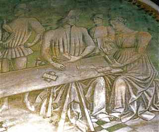 BTW, because of my interest in a possible Egyptian source I’ve researched ancient Egypt and been to Egypt twice, and I haven’t come across one piece of evidence that would support an Egyptian source for the Trumps. OTOH, I’ve been to Northern Italy and found Tarot iconography everywhere! The images were a regular part of early 15th century North Italian culture. The picture of people playing Tarocchi was taken by me (poor camera, poorer lighting, and an odd angle as it bordered the edge of a curved ceiling).