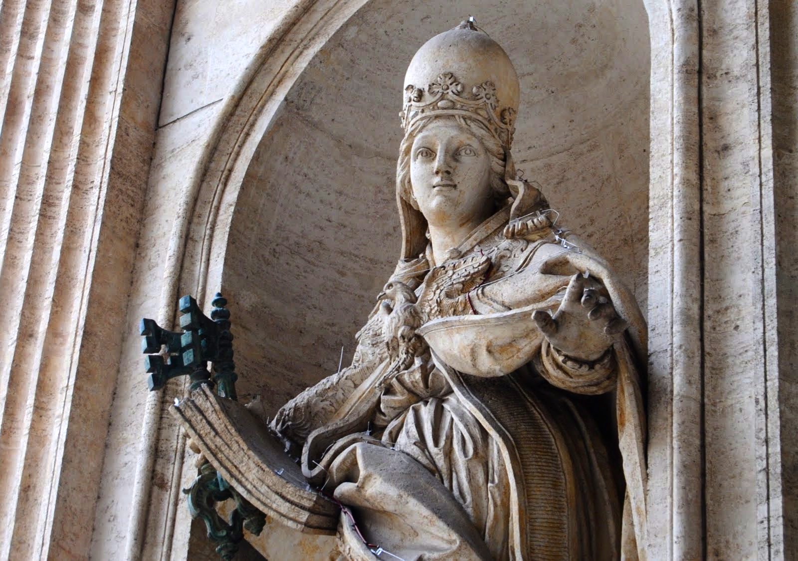 Many tarot scholars since Moakley have doubted Maifreda as source, nor do they give much credence to an older assumption that the card depicted Pope Joan (see article by Ross Caldwell). Instead, modern thinking proposes that it was always an allegorical image of Fides (Faith—see Giotto image to right), Sapientia (Wisdom), Ecclesia (Holy Mother Church) or the Papacy itself. Here’s an image from the Vatican itself: