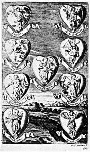The oldest example of each number card being spiritualized is found in 1666 in Belgium, in a book illustrated by cards, called Het Geestelijck Kaertspel, “The Spiritual Card Game with Hearts Trumps, or the Game of Love,” by Joseph a Sancta Barbara in which each of the Hearts cards is equated with a Christian subject. The King references God the Father, the Queen is the Virgin Mary, the Knave shows the rich and mighty [made humble?] before the Crucified Christ, the ten shows the ten commandments. Then there are the nine choirs of angels [see at right], eight Christian virtues; seven works of mercy; six goals in life; five wounds of Christ; four last ends, the three members of the Holy Family; the worship of God the Father and Mary the Mother; and the one Truth that must reside in a Christian heart. (Hargraves, A History of Playing Cards, p. 161.)