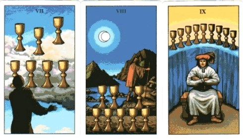 If you would like, in the Comments, also tell us your “tarot flow” story for the cards pictured below. How does the 8 of Cups card follow from the 7 and lead to the 9 of Cups? If the 8 of Cups is reversed, then how might you be better able to handle it by first revisiting the 7 of Cups?