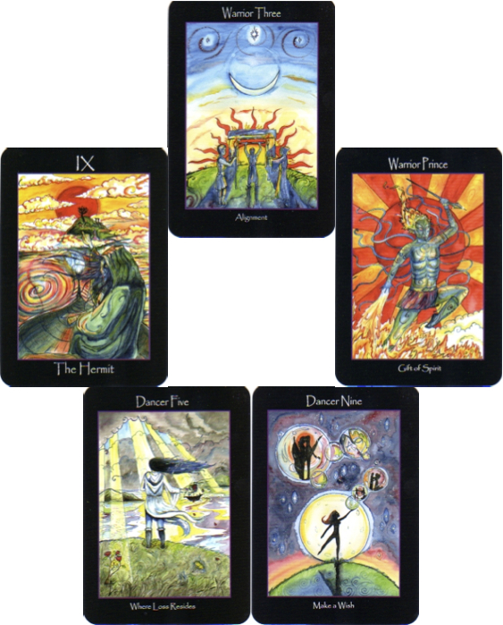 Jeanne’s spread guidelines suggest looking at the relationship between what has been established and what needs to be developed. Going from a Five to a Nine Dancer (Cups), says I need to release old disappointments and move to a new level. Confirming this is the backward-looking Hermit, which can hinder me, and the forward looking Prince who demands action. I react to the Hermit with a comfortable understanding (he’s my Soul Card and the only Major Arcana), while the dynamic energy of the Warrior Prince is daunting. There are two each of Water and Fire (which, according to the Golden Dawn, cancel each other out). Here, they represent the dual nature of wanting to stay put or go with the flow and wanting to do something fiery and new.