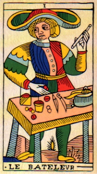To me, the Magician (no matter from what deck) is saying the SAME thing. After all, he is a “performer”…He wants the audience, (Querent ,) to believe him. He uses all the tricks , or props of his trade to help “sell himself”…but, what it comes down to it, he is an actor playing a part. His façade is convincing…but, don’t be fooled by this guy. He is “just a man” with a clever gimmick. “You gotta have a gimmick, if you want to get ahead”….(Song from “Sweet Charity”). Just look at all the “tricks of the trade he uses…without them, he’s nothing that “special” He’s like the “traveling salesmen in the early 1900’s that sold various “tonics”. I like him, he is so theatrical and showy…perhaps his advice is …with the right Props” and ‘tricks” andspeech…you too, can fool others.