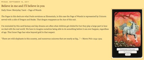 Often there are no more than a half dozen sentences. Entries begin with a title, the deck and the card. These are followed with three brief paragraphs: 1) first thoughts on card image, 2) personal associations regarding card meaning, 3) an inspirational quote on a related topic. The card is pictured in a space to the right. Sharyn switches to a new deck every Sunday and usually adds a brief deck overview at that time.