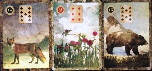 Decks: The 1910 (Pamela”A”) Rider-Waite-Smith deck. The Königsfurt Lenormand Orakelspielkarten, based on the 19th century Dondorf Lenormand (borders cut off).
