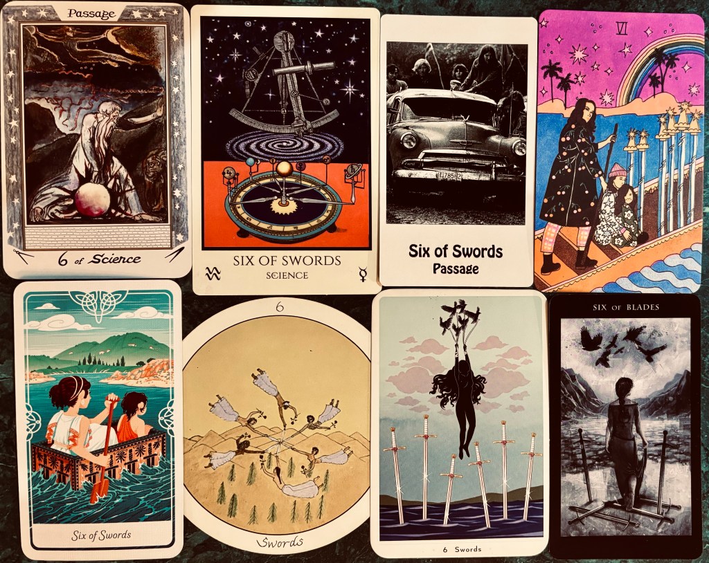 In preparation for the July 2026 Omega Institute tarot workshop, “Wisdom of the Tarot,” I have been posting on Facebook multiple versions of Minor Arcana cards from 21st century tarot decks for comparison. I ask if any keywords or phrases work equally well for all the different decks – one of the themes for the upcoming workshop (stay tuned). My latest example was the 6 of Swords. [It should be noted that the vast majority of new decks are at least loosely based on the Rider-Waite-Smith (RWS) pictures.]