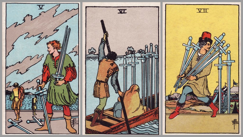 In my imagination, I call the 7 of Swords the “James Bond 007 card”. Following his machismo proof-of-ability in the 5, in the 6, Bond reaches the enemy island, where the villains have assembled a machine of mass destruction. In the 7, he strategically disarms it, winning the day. So, this is a card of disarming either the enemy or some greater force working against your well-being. Yes, it is still lying, cheating, stealing but for what purpose, against whom or what? One other perspective is that of going to the library to gather research: assembling information. To bring it up-to-date, it could be the designers of AI stealing data from copyrighted authors and artists!