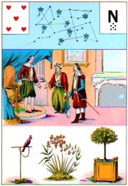 It’s been thought for several years that the Lenormand images were derived from Coffee-ground fortune-telling or Tasseomancy. This work is the missing link that proves this theory. It has been curious that several of the Lenormand images were not found in the old lists of coffee-ground emblems, but now we know that several cards were added to the original set. The reason for the expansion of the deck to 36 cards probably came about when Hechtel decided to combine “Les Amusements des Allemands” with the German 36-piece playing card deck, which was then more popular than either the 32-card Piquet deck or the 52-card deck.
