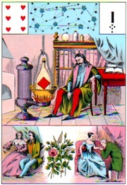 Quite a few old German decks featuring proverbs and sayings that must have been used for obtaining advice and prognostication of how a situation would progress. The suits consist of Green Leaves (Spades), Red Hearts (Hearts), Yellow Bells (Diamonds) and Black Acorns (Clubs). Acorns (Clubs) are generally the worst suit, while the Green Leaves (Spades) are the best suit.