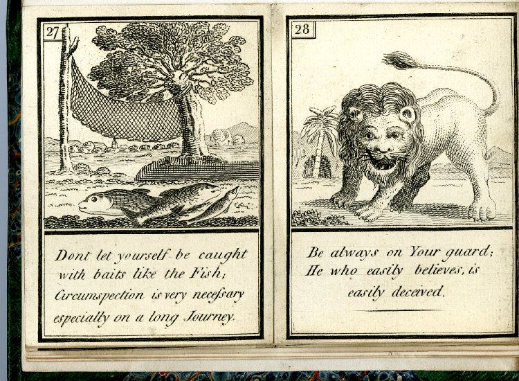 A sequence of 32 playing-cards bound (at the British Museum) as a small book, having on them emblematic designs of various character, and below moral apophthegms to which the designs have reference. Each piece has a number at the upper left-hand corner answering to certain explanatory and descriptive tables given in a book of directions which accompanies the cards. The title page of this book of 31 pages bears the following lettered inscription: “Les Amusements des Allemands, or The Diversions of the Court of Vienna, in which the Mystery of Fortune-Telling from the Grounds of the Coffee-Cup is unravelled, and Three pleasant Games, viz.: 1. Fortune-telling from the Grounds of the Coffee-Cup. 2. Fortune-telling by laying out the cards. 3. The new Imperial Game of numbers are invented”, and “London: Printed for Champante and Whitrow, Jewry-Street, Aldgate, and may be had at every Booksellers and Toy Shop in the Kingdom, 1796.” Engraving and letterpress Backs plain (according to Willshire) 1796.