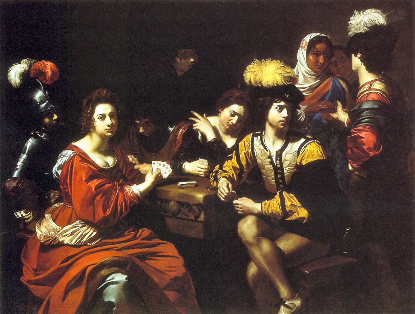 Here’s a second painting that clearly tells a story (see the earlier Dorés’ Saltimbanques). This picture is by the Flemish painter Nicolas Régnier (1591?-1667), a contemporary of Caravaggio, who spent most of his life in Italy. Many of Régnier’s paintings show the seamier or more frivolous side of life and several feature gypsies. One commentator characterized his work as expressing a “poetics of seduction.” This painting from around 1620 has variously been entitled Kartenspielende Gesellschaft and The Cardplayers and the Fortune-Teller. Use the Comments to tell us what story (or stories!) you see in this picture. What relationship might the artist be implying between cards and palm reading? What do each of these nine people want? Click on the image to see a larger version. Have fun.