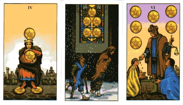 Let’s say you got the 5 of Pentacles. Your partner may be feeling emotionally cold and thinking that sticking with you, right now, is a hardship to be endured. That can be pretty depressing. But if you consider both the 4 and 6 of Pentacles, then you could consider whether your partner might have made a firm commitment to holding on to the relationship (4 of Pentacles) and is aware of a possible pay-off later (6 of Pentacles). It’s just that right now he or she is feeling hurt or going through a cold spell that might be only temporary. Do you see other possibilities for this sequence?
