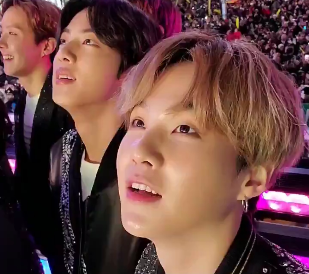Regarding the recent explosion of BTS on the world stage, Suga explained that he aspired to reach the 12th floor [of fame] only to find himself on the 60th floor. “The moment I’m flying high as I wished, my shadow grows larger, beat down upon by that light. Please don’t let me shine. Don’t let me down. Don’t let me fly.”
