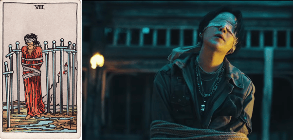 The Peasant is imprisoned and condemned to death by the murderous King: “Who’s the King who’s the Boss. Everyone knows my name.” This scene shows Agust D bound and blindfolded like the figure in the 8 of Swords.