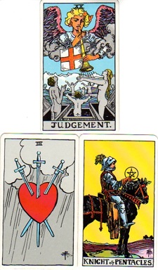 The cards Heidi drew from the RWS deck were Judgment, Three of Swords, and Knight of Pentacles. Knowing that Heidi’s father had recently died, we predicted that her feelings of grief for her father would be strongly triggered but would result in some kind of awakening or acceptance of her loss. She told us she would be going to his home three hours away to tie up his financial affairs and we warned that going through his papers would probably be very difficult.
