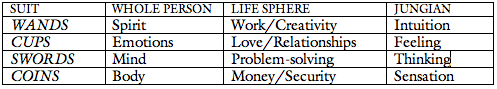 Most of you have seen or used a spread with four positions based on the four suits of the Minor Arcana. Usually it describes what is going on at four levels: body, mind, emotions and spirit, or some similar quaternity. I sometimes lay out four aces from one deck as position holders and then lay cards from a second shuffled deck on top of each ace. Sometimes a fifth card/position integrates the whole or offers advice.