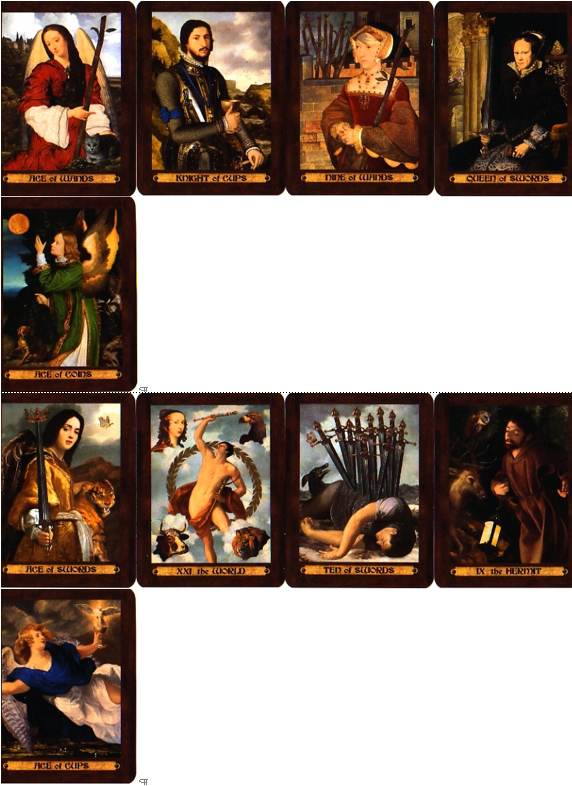 Row 3: I can successfully triumph (World) over the most extreme difficulties (10 of Swords) by calmly applying my wisdom and experience (Hermit) and by letting go of something that is not going anywhere (10 of Swords again).