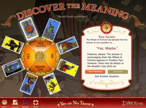 I was completely surprised to discover that a reading I designed for tarot.com has been turned into an app for the iPad called Yes/No Tarot (just out this month). The animated introductory scene is outstanding!—worth the price of the app for that alone. The Spread has been vastly simplified from the version available at tarot.com—the Yes or No Tarot Reading. In the App-version, you get the basic answer but the only details about the cards in the spread are a short comment for each Major Arcana (if any turned up in the reading). That’s disappointing since, in the on-line version, you also get an analysis of suits and what elements are missing from the spread. I guess the point of the app is that you get a quick answer and then can ask again (or from a different perspective) as much as you want. You can also save your answer to a journal. If you would, please leave a review or rating, as well as letting me know what you think here.
