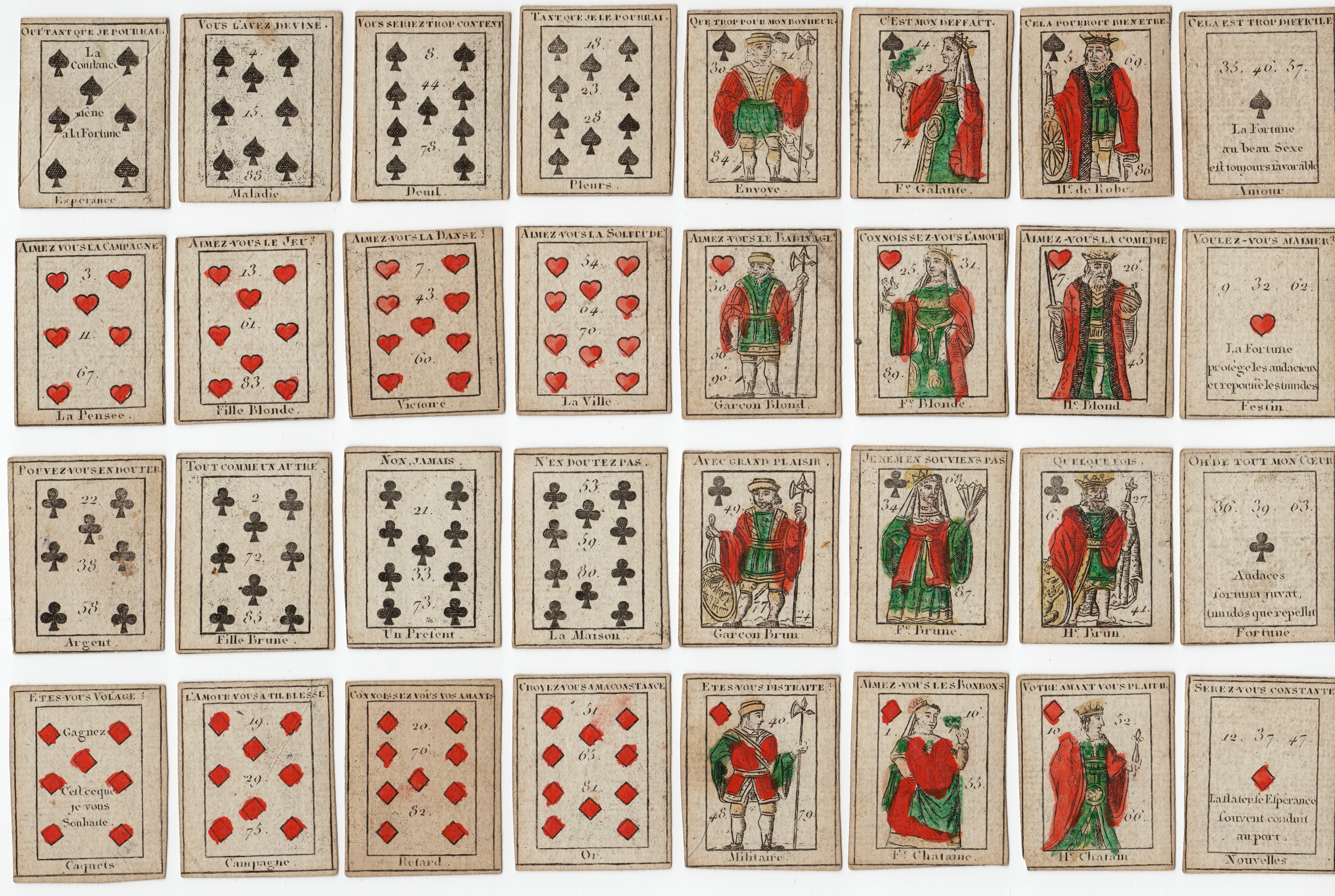 Playing cards were used for fortune telling in conjunction with the 1505 German Mainz Kartenlosbuch (literally, card-lot/fortune book). Fortunes in this work include such things as: