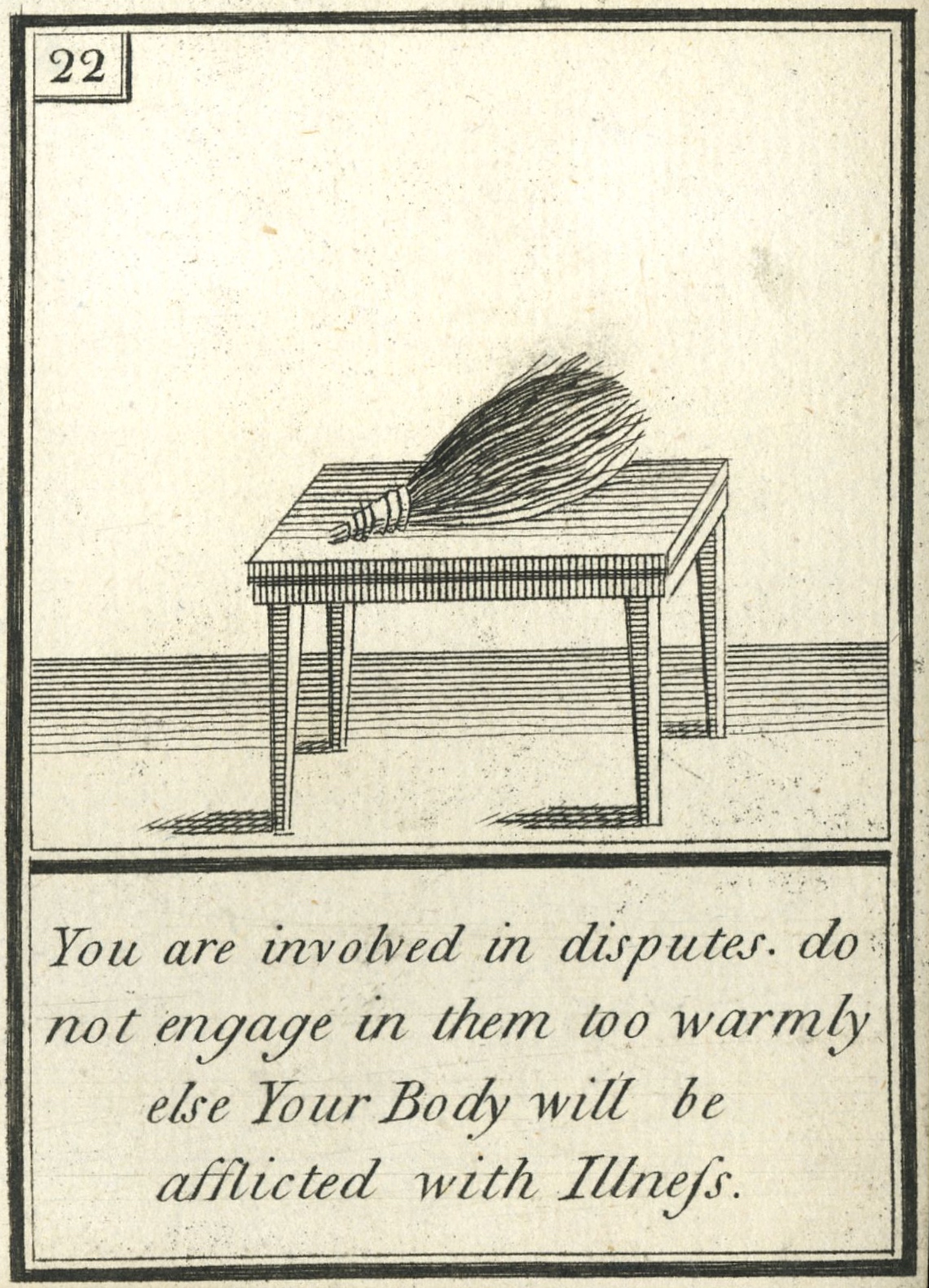 John Brand in his 1777 book, Observations on the popular antiquities of Great Britain, quoted from “an old chap book” what he called “curious lines on divination by drawing cards,” the source of which I’ve now found here. Example: