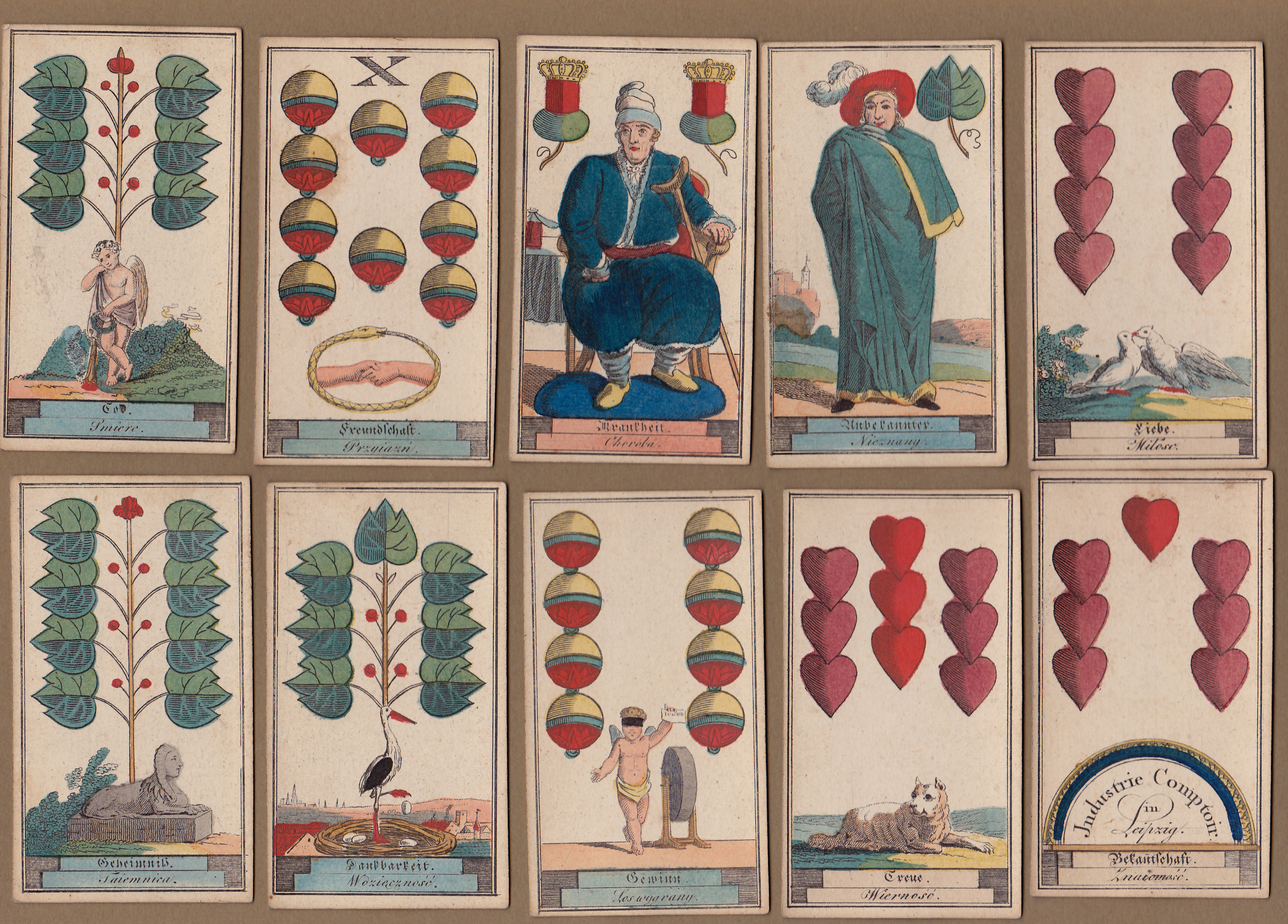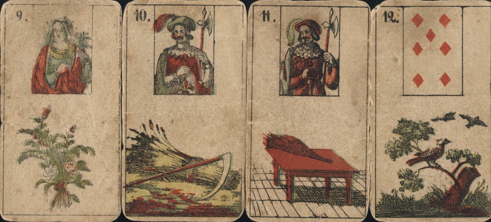 Quite a few old German decks featuring proverbs and sayings that must have been used for obtaining advice and prognostication of how a situation would progress. The suits consist of Green Leaves (Spades), Red Hearts (Hearts), Yellow Bells (Diamonds) and Black Acorns (Clubs). Acorns (Clubs) are generally the worst suit, while the Green Leaves (Spades) are the best suit.