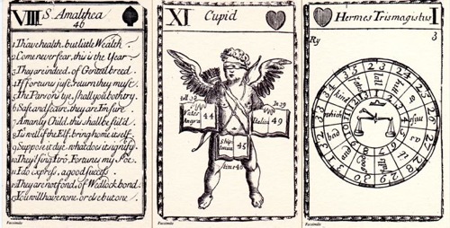A book called Whartoniana; or, Miscellanies, in verse and prose by members of the Wharton family (and several other persons of distinction) was translated from the French and published in 1727. (Edited by Edmund Curll and translated by Joseph Morgan). It contained a detailed account of a card game that resulted in a divination. In the Table of Contents the piece is titled “To the lovely PALLAS, Or the Game at Picquet.” [Thanks to Stephen J. Mangan, (aka Kwaw) at Aeclectic’s tarotforum for finding this.]
