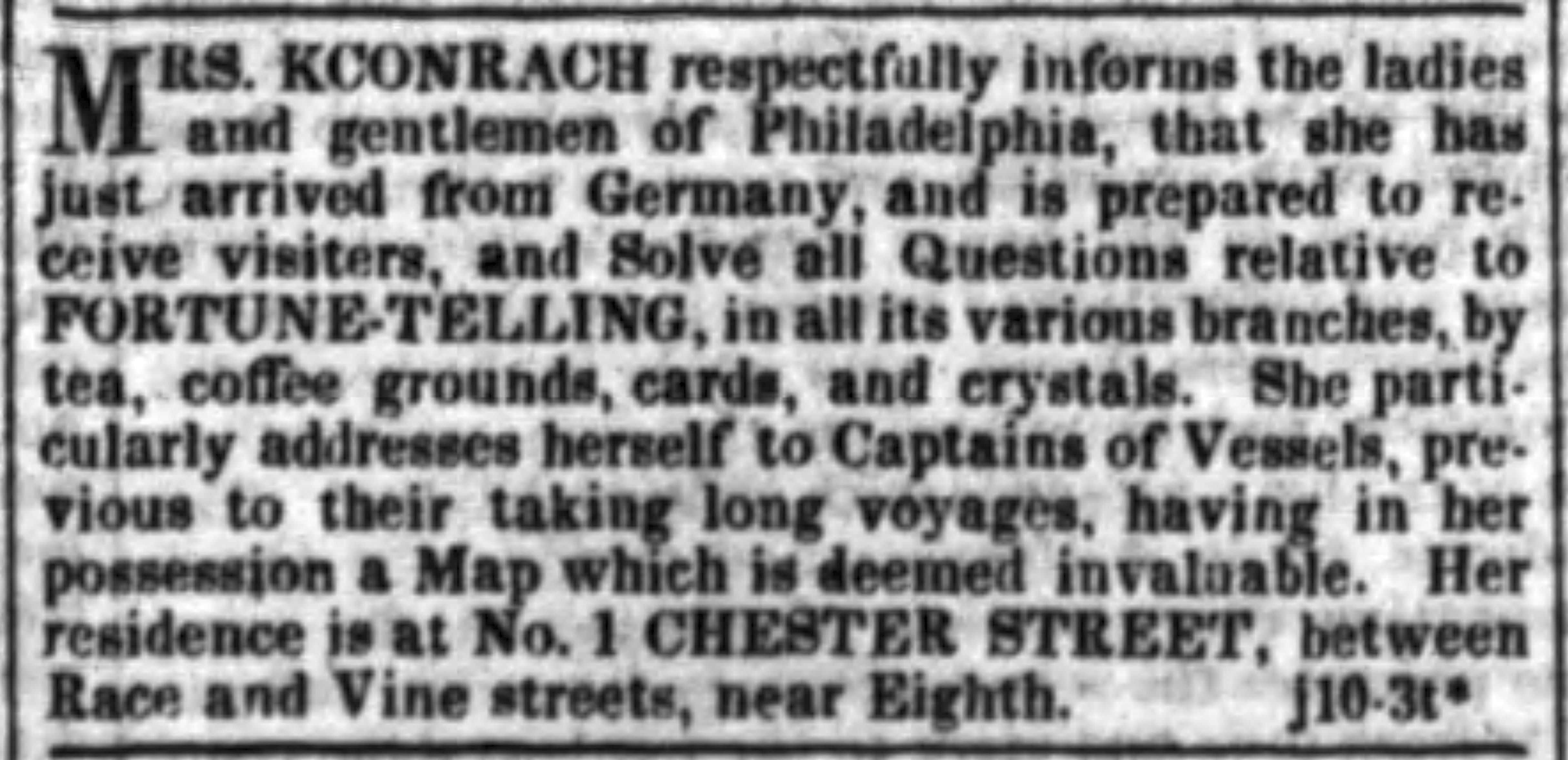 “Fortune Telling.—The Baltimore Transcript states that there are in that city no less than twelve professors of the art of divination or fortune telling. Most of them perform their incantations by the use of cards; but one old woman, wiser or more gifted than the others, pretends to delve into the mysteries of futurity by looking into an empty junk bottle! Strange as it may seem, the patrons of these vagabonds in the “Monumental city” are not confined to the low and vulgar. Some very genteel, respectable people—particularly ladies—run after these impudent imposters, to inquire after their future fate—as though “a tall, and mean, and meagre hag” knew more of the “shadows of coming events” than the beautiful and fascinating creatures whose bright eyes might if they would pierce into futurity even though it were a nether millstone.—Silly creatures! if they believe the predictions of these hags, they stand at least an even chance of making themselves miserable for life; if they do not, they certainly carry their time and money to a very bad market.”