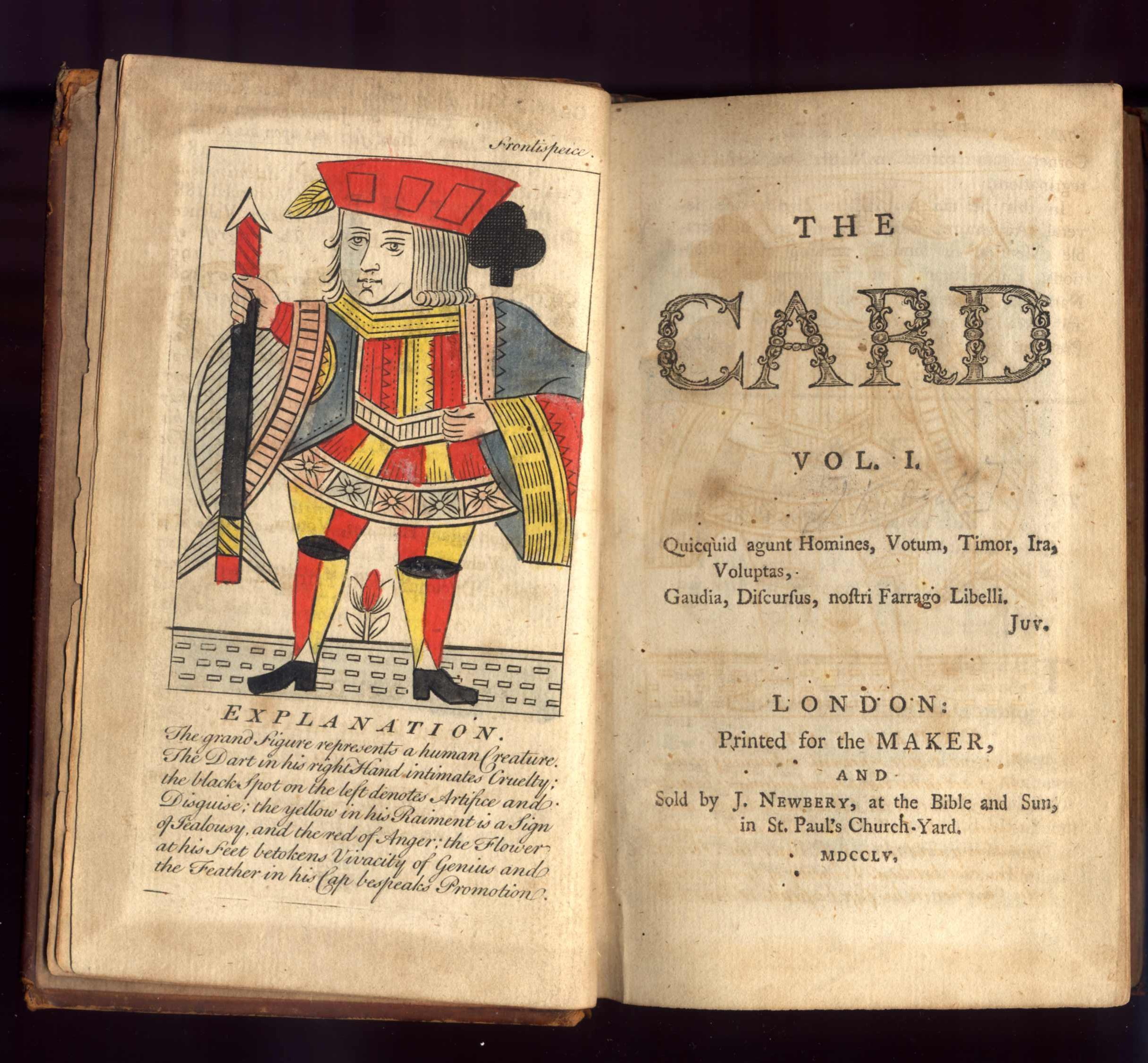 In 1755 we find a rambling novel in two volumes, The Card by John Kidgell (London: Printed for the Maker and sold by J. Newberry, 1755), that is famous as the first reference to a game of “baseball.” It is notable to us because of the frontispiece that features a large engraving of the Jack (or Knave) of Clubs, accompanied by a detailed commentary on its symbolism. I haven’t been able to find an online copy of the book to discover the role this figure plays in the text, but I would imagine it serves as Significator of the main character of the novel. It shows the kind of symbolism we tend to look for in cards when ‘reading’ them. Usually associated with Lancelot, this Jack also has a reputation as the scoundrel of the pack. The text explains: