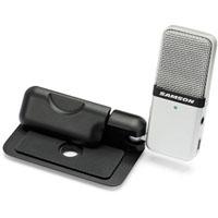 If you want an external, portable mic, then I highly recommend the Samson Go Mic. It’s very small (though surprisingly heavy), clips onto your iPad or stands alone, and works with the iPad USB camera connector. You can also plug headphones directly into the mic. It’s good enough for podcasts-on-the-go, although a pop-filter helps for optimum sound when in uni-directional mode. This video review is very helpful for understanding the three sound settings and hearing it in action.